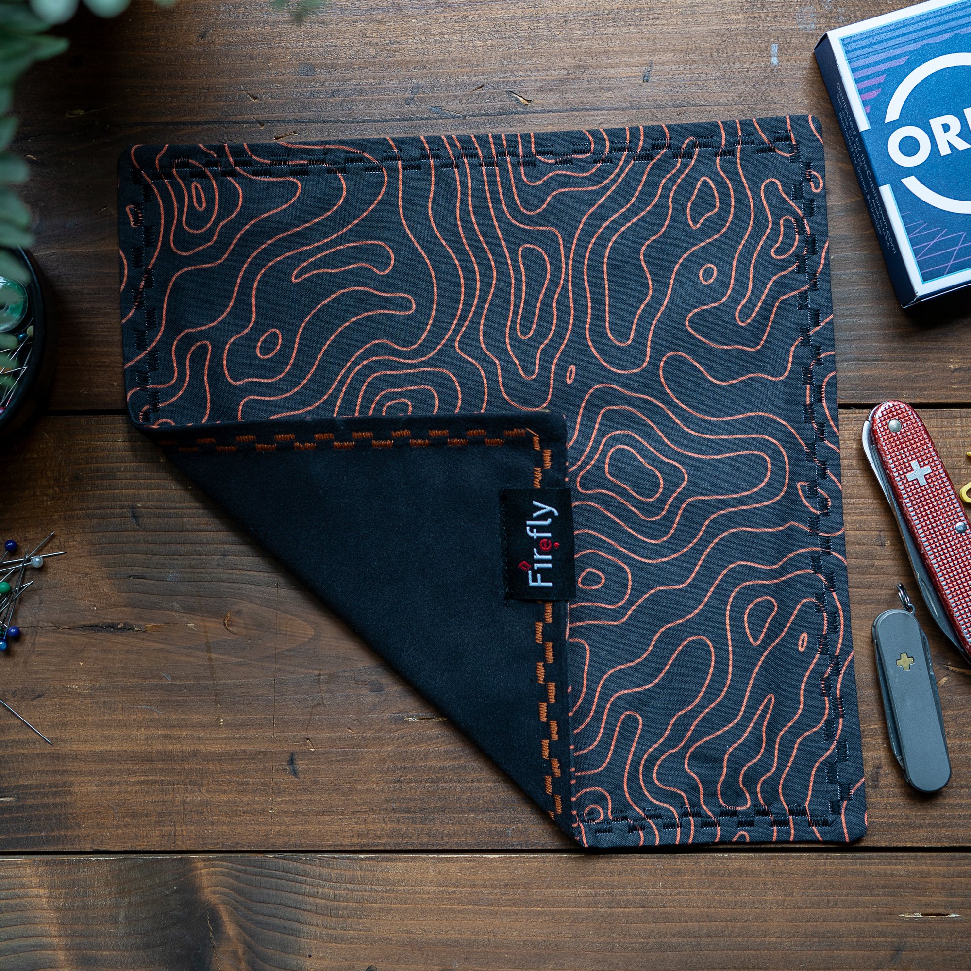 Bold and functional with a hint of trail-inspired flair. This half-pint hank features a deep black background overlaid with vivid orange topographic contour lines. Perfect for those who appreciate detail and design.
